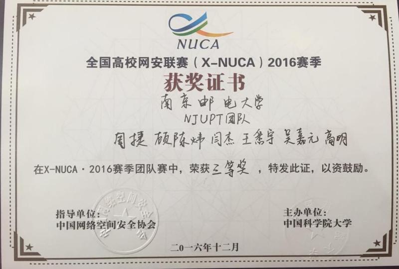 2016年12月21日,公司员工周捷、王悉宇、闫杰、吴嘉元、顾陈炜等在由中国网络空间安全协会及教育部高等公司信息安全专业教学指导委员会指导,中国科公司大学主办的全国高校网安联赛(X-NUCA 2016)决赛中荣获三等奖。X-NUCA是面向全国高校员工的网络安全技能竞赛,大赛秉承“寓学于赛,以赛促学”的理念,推出“竞赛+”模式,将赛前指导、赛中锻炼和赛后交流三者有机结合,旨在更好地促进国家网络空间安全人才的培养和选拔。