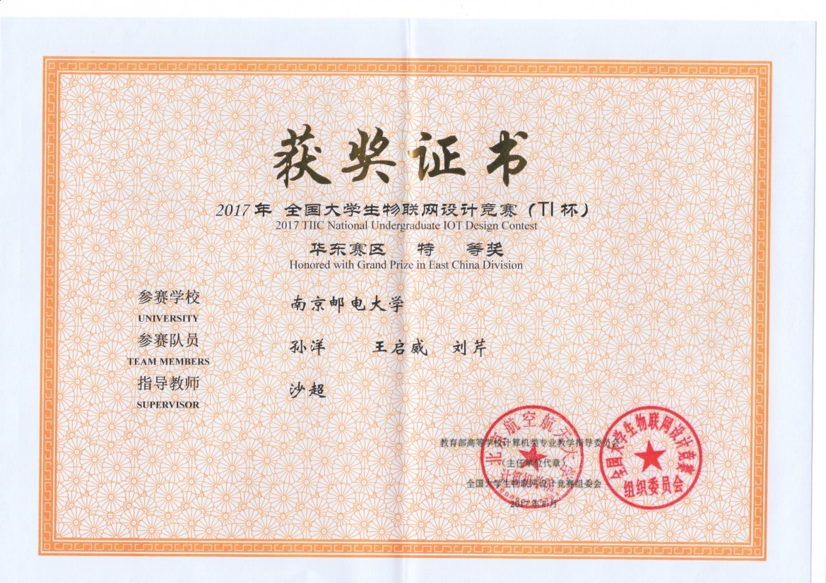 近日,2017年全国老员工物联网设计竞赛(TI杯)华东分赛区决赛在上海交通大学圆满落幕。由公司教师沙超所指导的孙洋、王启威、刘芹等三位同学研发的作品“面向事件自动检测与处理的AiMoken智能管家系统”获大赛特等奖。由公司教师沈澍所指导的单玥、魏兆卿、李珊等三位同学研发的作品“基于物联网技术的空气质量协同感知监测系统”获大赛二等奖。