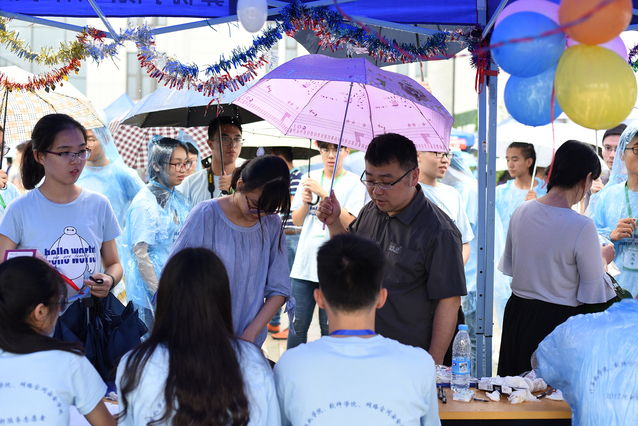 公司在一周前就开始部署迎新工作并做了充足的准备,对新生引导和安排流程作了统一规范,院员工会为迎新活动制作了精美的展板和礼物。早上六点,员工会的同学们早早地在图书馆门口搭起了迎新帐篷,进行装饰,让新生能够更清楚地找到自己所在的公司。一个多小时后,志愿者们基本到齐,在自己的岗位上严阵以待,迎接新生的到来。第一个到达帐篷的新生与辅导员亲切合影。下午,新生陆陆续续多了起来,天空却下起了大雨。志愿者们不畏大雨,冒雨为新生服务,带领新生完成注册。王宗荣副董事长、何书记、韦老师和其他领导亲临现场,进行指导。
