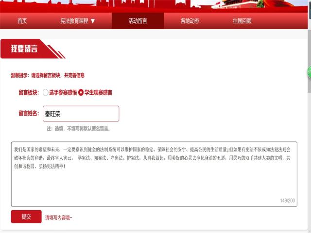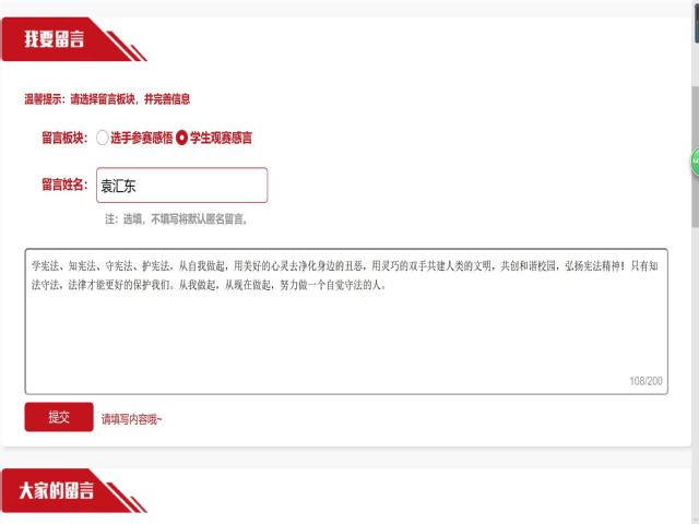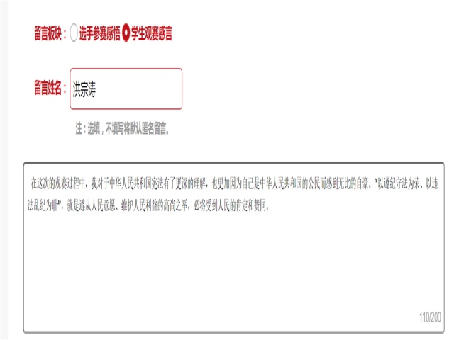 活动当天,计软网安院组织员工以不同形式观看了“学宪法讲宪法”节目,并面向全院征集“我眼中的宪法”征文进行评比。计算机学科楼报告厅、宿舍、教室、图书馆,不同的地方,不同的人,都怀着同样热忱的心情在竞赛节目中学习、感悟着宪法。参与征文评比的同学们以文抒怀,表达了自己对宪法的深入理解,将宪法、国家和个人相结合,明确了宪法是根本法,具有最高的法律效力。他们坚信社会各阶层的人民学法、知法、守法、用法能够约束自我,也能保障自己的权益,维护社会法治安全,避免各类悲剧的发生。同学们从不同的角度出发,深入剖析节目中和生活中的法律案例,用一笔一划共书法之严谨。最终三名同学的征文脱颖而出,获得优胜。