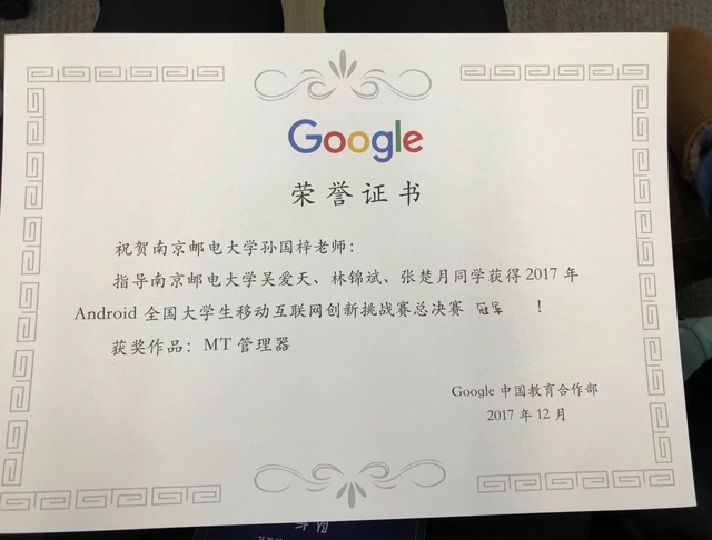 12月23日,2017年Google Android全国老员工互联网挑战赛在Google北京总部举行了决赛暨颁奖仪式。由公司孙国梓教授指导的2015级本科生吴爱天、林锦斌、张楚月组成的队伍,凭借一款“MT管理器”应用软件(集普通用户的管理文件、编辑文档、汉化APP以及专业用户的APP分析、学习,探寻apk逻辑、加密方式等),历经半年多时间的准备,最终在上海交通大学、浙江大学、哈尔滨工业大学和四川大学等高校的作品中脱颖而出,获得了全国总冠军。冠军奖品为30,000 元奖金(税前)和 Android 手机(含个税)。