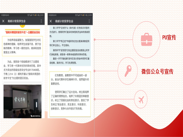 本次致敬经典团日活动主要包括五个部分。第一部分是利用红色文化与红色资源对青年学子进行革命传统教育与爱国主义教育开展的主题班会――我和共青团的前世今生。其中信息安全专业B170408班尤为突出。第二部分是以了解历史,感化历史为目的进行的参观红色古迹活动――参观雨花台风景区。B170401团支部的同学们前往风景区,感受到了自然风景下衬托的红色文化。第三部分是学习革命精神,以史为鉴的红色观影活动。各班团支书积极组织同学们观看《建国大业》、《绝对忠诚》等红色影片,回顾红色历史,铭记革命精神。第四部分是以出口成诗,经典之声等新颖的方式宣传十九大精神的活动,B160401团支部以历史为起点,感受老一辈革命先烈的精神。最后的部分是分享读书心得和探讨当代老员工所面临的问题,同学们分享了读书心得,并对未来提出美好畅想。公司还广泛开展致敬经典配音秀活动,公司分团委大力支持,B170408团支部表现突出,被评选为十佳团日。