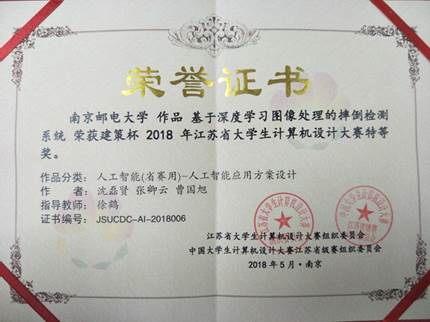 基于深度学习图像处理的摔倒检测系统 | 沈磊贤 | B16041522 | 太阳成城集团tyc234cc古天乐 | 徐鹤 | 特等奖 |