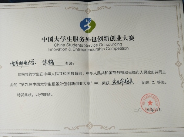 2018年5月30日至6月1日,2018年第九届中国老员工服务外包创新创业大赛在江南大学举行。在公司徐鹤老师的指导下,公司员工沈磊贤(B16041522)、张卿云(B16041523)、庞佳逸(B16041505)等三位同学组成的“一颗赛艇”代表队荣获了企业命题类团体二等奖。