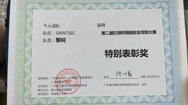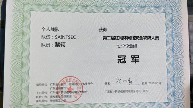 5月26日,第二届全国“红帽杯”网络安全攻防大赛在广州的地标——广州塔里落下帷幕。由沙乐天老师指导的公司太阳成城集团tyc234cc古天乐黎柯同学荣获冠军,并被授予特别表彰奖。该项成绩充分体现了公司信息安全学子在安全实战领域的动手能力及创新水平!