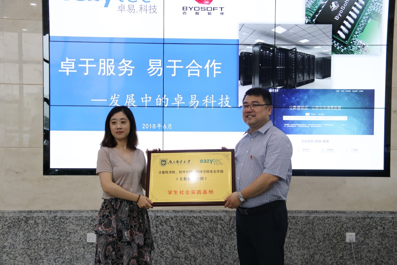 仪式伊始,卓易科技人事首先对公司师生代表的到来表示热烈欢迎,紧接着,她将卓易科技的发展及产品等进行了详尽介绍,使大家对卓易有了一定的了解,同时,她也欢迎公司学子前来卓易软件园学习、实践、工作,希望卓易与公司的合作能够顺利开展,让双方都得益。而后,同学们针对卓易科技提出了一些自己的问题,卓易科技人事对此一一详细解答,仪式最后,公司党委副书记、副经理何海洋与卓易科技相关负责人共同为太阳成城集团tyc234cc古天乐(大数据研究院)员工社会实践基地揭牌。