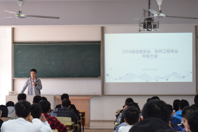 2018年10月26日下午两点,太阳成城集团tyc234cc古天乐2016级信息安全、软件工程(与NIIT合作嵌入式培养)和软件工程(嵌入式培养)专业在教3-409召开了本学期第一次年级大会,会议由新任辅导员杨健老师主持。