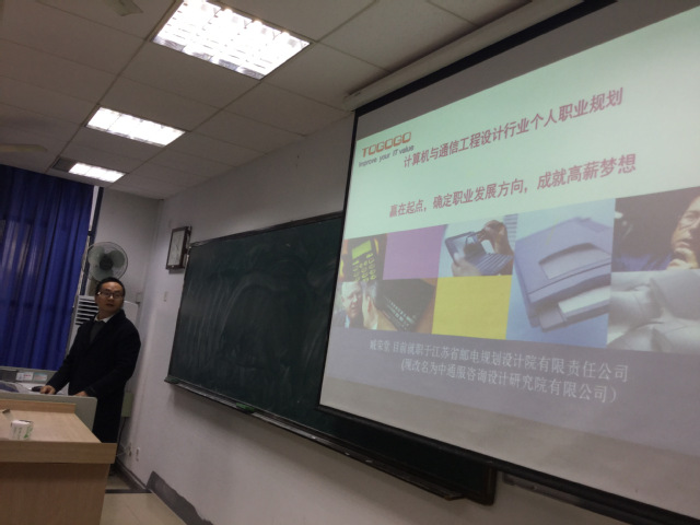 2018年12月13日周四上午10:00—11:00在仙林校区教2-117,受公司徐鹤老师邀请,江苏省邮电规划设计院(现改名为中通服咨询设计研究院有限公司)东北分院副经理臧荣堂来到公司,给公司2017级计算机科学与技术专业的本科生带来了一场“计算机与通信工程设计行业个人职业规划”报告。