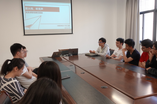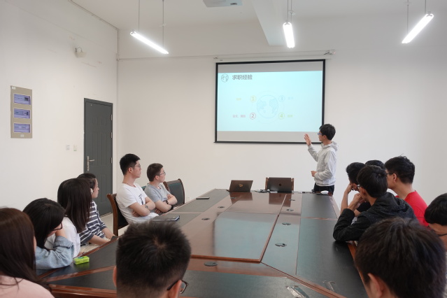 活动伊始,许春杰首先作为互联网企业求职代表结合自身求职经历给大家讲述了求职的五个步骤:简历制作、简历投递、笔试、面试、签约,并针对每一个环节需要注意的事项给支部成员提供了建议。随后谢豪结合自身求职经历讲述了在求职中如何自我定位、招聘信息的获取、简历投递、面试经验等,还为大家详细分析了不同类型企业的利弊,为想去国企的同学提供了参考。他还提醒大家要在研究生期间就为日后求职做好准备,提升自身的硬实力。