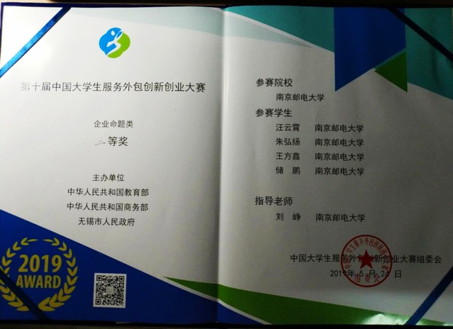 2019522日至524日,第十届中国老员工服务外包创新创业大赛在无锡江南大学举行。公司刘峥老师指导的,由公司汪云霄、王方鑫、储鹏和电子与光学工程公司、微电子公司的朱弘扬同学组成的代表队荣获企业命题组团体二等奖。