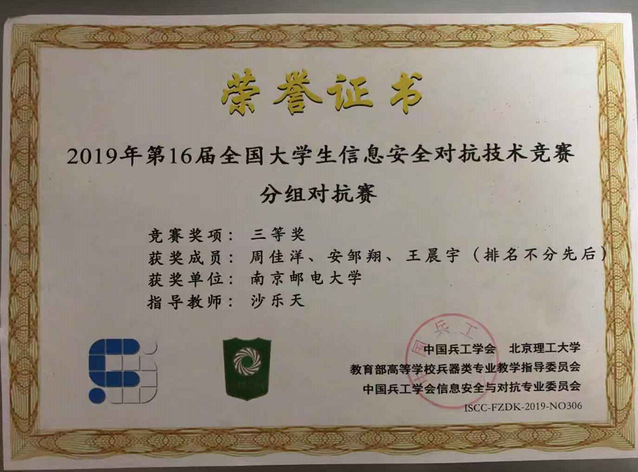 7月19日,第十六届全国老员工信息安全与对抗技术竞赛总决赛在北京理工大学落下帷幕。由沙乐天老师指导的公司周佳洋、安邹翔、王晨宇同学总成绩第10名,获得三等奖。三位同学在本次比赛中充分体现了公司信息安全新生代学子在信息安全实战领域的动手能力及创新水平!