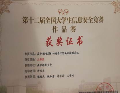82日,第十二届全国老员工信息安全竞赛作品赛总决赛在东南大学落下帷幕。由沙乐天老师指导的公司战队作品“基于Bi-LSTM的内存冲突漏洞检测系统”(张皓天、姚如意、许泽遥、王于叶)、“基于决策树分类器的PHP应用自我保护方法”(黎轲、覃国祥、章文斌、杨少凯)双双荣获总成绩三等奖。该项成绩充分体现了公司信息安全学子在信息安全技术领域的动手能力及创新水平!