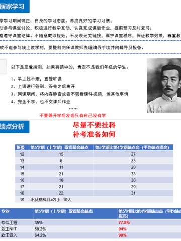 在学风建设方面,吴忧老师对各班和各专业的绩点进行了分析,罗列了上学期取得最高绩点和平均绩点提高的相关数据,其中软件工程(嵌入式培养)专业和软件工程(与NIIT合作嵌入式培养)专业平均绩点提高人数均在90%以上,肯定了同学们的努力和进步。接着,吴忧老师向同学们展示了公司大一员工线上云自习和B170416班郭俊茹同学学习打卡的图片,强调居家学习期间端正学习态度和培养自主学习习惯的重要性,提醒需要补考的同学珍惜时间,认真复习。