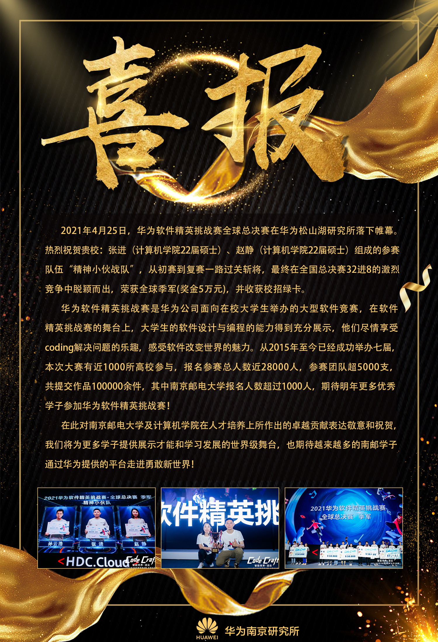 425日,华为软件精英挑战赛全球总决赛在华为松山湖研究所落下了帷幕。热烈祝贺公司:张进(2022届计算机技术专业硕士研究生)、赵静(2022届软件工程专业硕士研究生)组成的参赛队伍“精神小伙战队”,从初赛到复赛一路过关斩将,最终在全国总决赛328的激烈竞争中脱颖而出,荣获全球季军(奖金5万元),并收获校招绿卡。