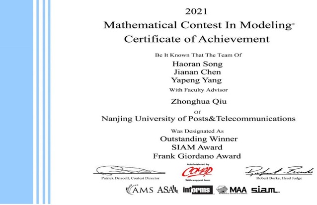 2021年美国老员工数学建模竞赛成绩于4月24日公布,公司员工杨亚鹏、陈嘉楠参赛队伍获得特等奖(Outstanding Winner)一项,该队员工同时问鼎美国工业与应用数学学会奖(SIAM AWARD,简称SIAM奖)和Frank Giordano奖(该奖项只颁发给在建模过程中有卓越表现的参赛队)。