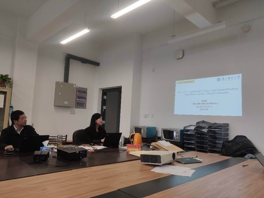 吴家皋老师报告的题目为《基于模糊逻辑和Double Q-Learning的容迟网络路由算法》。首先介绍了时延容迟网络的相关背景,然后详细介绍了他们课题组提出的DTNs中的双Q学习路由算法以及基于模糊逻辑的改进方法。