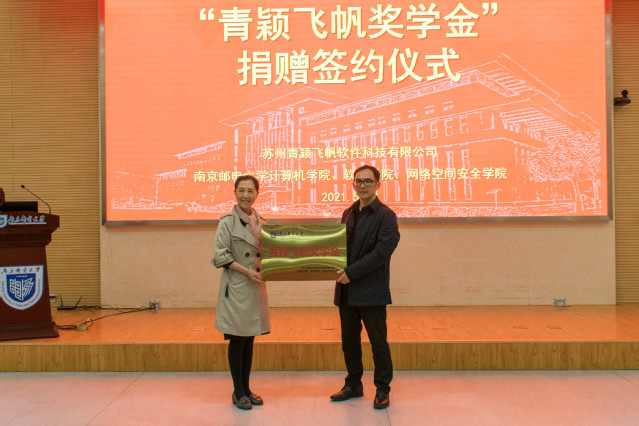 作为从海外打拼归国创业的众多优秀南邮人之一,宋凡总裁表示,在南邮学习生活的四年为他工作事业的发展奠定了坚实的基础,南邮严谨务实的学风所形成的宝贵“工程师精神”给予了他深厚滋养,是他一路奋斗的不竭动力,作为同学的公司联合创始人陈文鑫员工,也始终秉持这份烙印在心的南邮精神和情怀,一同投身互联网教育事业,创立了今天的苏州青颖飞帆软件科技有限公司。本次设立奖学金既是作为员工积极回报母校的一份荣誉和责任,也希望能激励更多的南邮学子脚踏实地,勇攀高峰,做新时代的“红色工程师”。