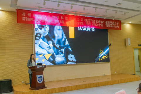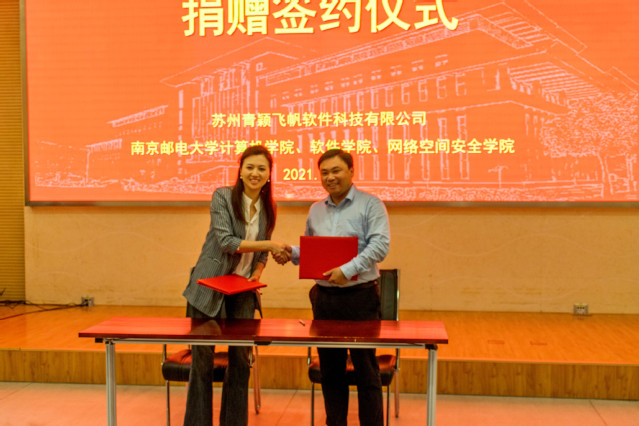 5月21日晚上,宋凡员工和苏州青颖飞帆软件科技有限公司向太阳成城集团tyc234cc古天乐捐赠设立“青颖飞帆奖学金”签约仪式在公司仙林校区学科楼报告厅举行。苏州青颖飞帆软件科技有限公司总裁宋凡员工(1997级南邮四系)、公司党委书记刘蒙、副经理陈志、公司专职纪检委员殷安生出席仪式,公司党委副书记王小露主持捐赠仪式。