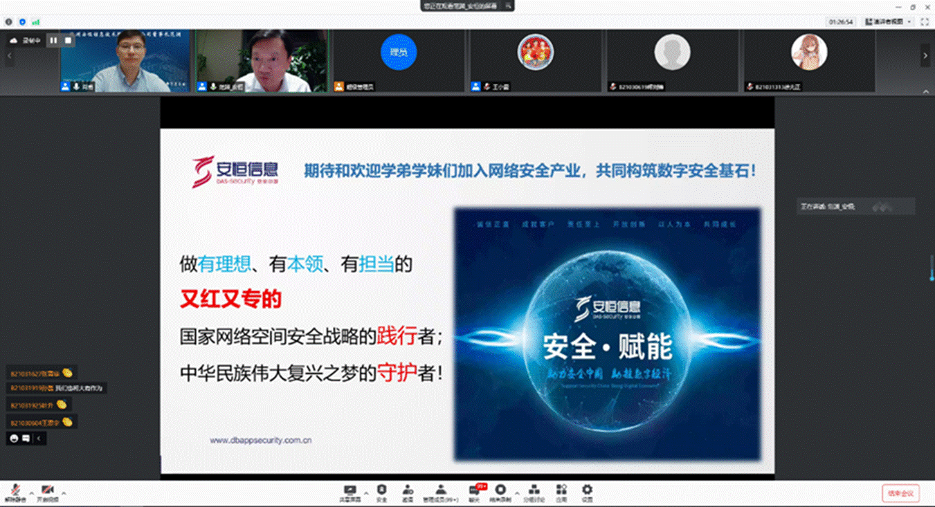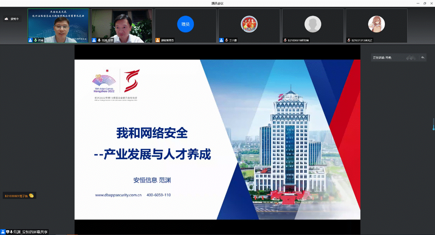 安恒信息作为中国领先的专注于信息安全产品和服务的解决方案提供商,在应用安全、数据库安全、云计算安全、移动互联网安全、工业控制系统安全、智慧城市安全等领域具有行业领先优势,是全球网络安全创新500强企业、阿里巴巴使命级战略合作伙伴,先后为北京奥运会、国庆60周年庆典、上海世博会、抗战胜利70周年纪念大会、历届世界互联网大会、G20峰会、国庆70周年庆祝大会等重大活动提供全方位网络信息安全保障。2019年12月,公司与杭州安恒信息技术股份有限公司达成长期战略合作协议,共同打造网络空间安全创新人才培养基地。