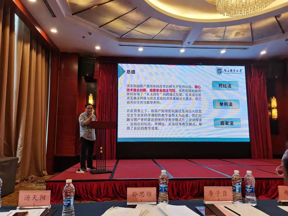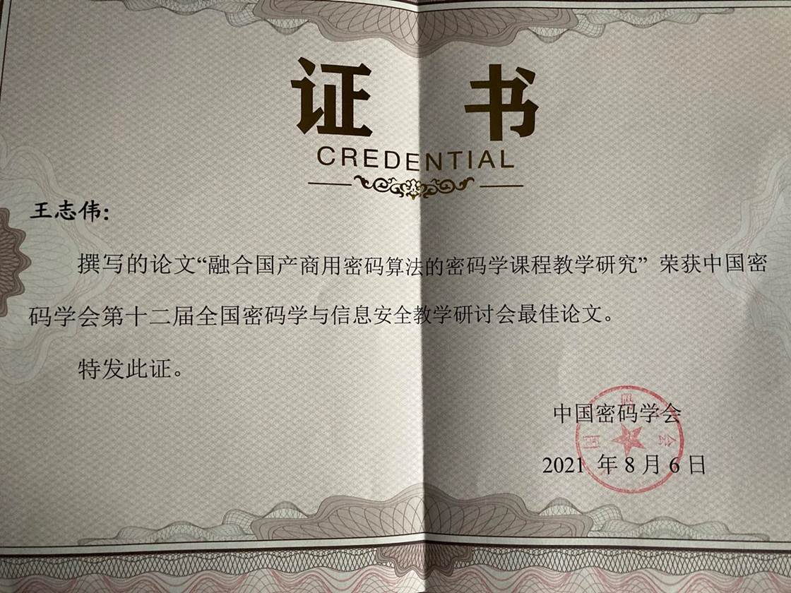 中国密码学会第十二届全国密码学与信息安全教学研讨会于2021年10月14-16日在重庆邮电大学召开。本次会议是由中国密码学会教育与科普工作委员会主办,由重庆邮电大学承办,西安邮电大学,深圳市纽创信安科技开发有限公司协办。研讨会由中国密码学会副理事长徐茂智教授致辞,有来自北京大学,中国科公司大学,西安电子科技大学,南开大学等高校专家作特邀报告。公司教师王志伟老师撰写的《融合国产商用密码算法的密码学课程教学研究》论文荣获第十二届全国密码学与信息安全教学研讨会最佳论文奖。王志伟老师应邀作论文报告,并与其他国内从事网络空间安全领域教学科研工作的专家学者,就我国密码学和信息安全专业的教学教育改革、教材建设、专业建设、团队建设、产学研结合等一流专业、一流团队建设问题展开了深入交流。