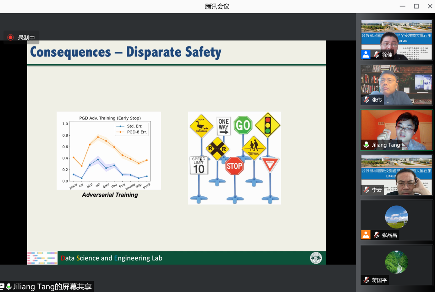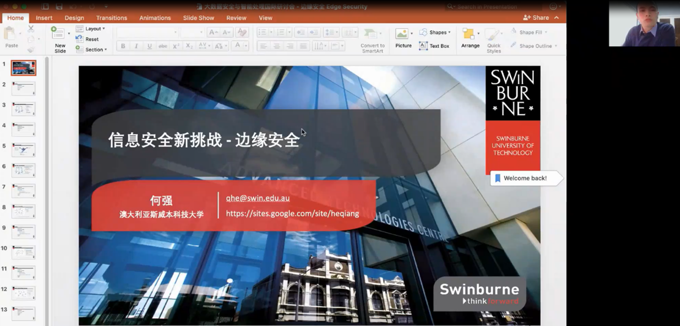 在随后的学术报告环节,美国密西根州立大学汤继良副教授、内布拉斯加大学林肯分校张宽助理教授、中新赛克安全创新中心总经理孙浩、星环信息科技资深技术总监杨洪山、南京理工大学周永彬教授、中国电信安全首席专家王爱宝、香港中文大学(深圳)深圳市大数据研究院大数据安全计算实验室主任吴保元、暨南大学温金明教授、澳大利亚斯威本科技大学何强副教授等9位国内外大数据安全领域知名专家受邀分别作了“可信人工智能中的安全性和公平性可以兼得吗?”、“Security in edge-assisted Internet of Things: Challenges and Solutions”、“构建数字化转型背景下的工业互联网安全保障体系”、“数据智能处理技术发展趋势及行业应用”、“一类计算型高阶掩码方案的安全脆弱性”、“数字经济时代安全技术发展趋势”、“现实场景下的黑盒对抗攻击与防御”、“格规约与格困难问题简介”、“边缘安全新挑战”的专题报告。针对参会代表感兴趣的话题,专家们通过网络进行了解答。线上会议讨论热烈,学术氛围浓厚,进一步加强了公司在大数据安全领域的对外合作交流。