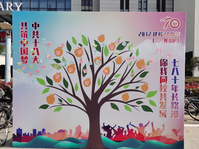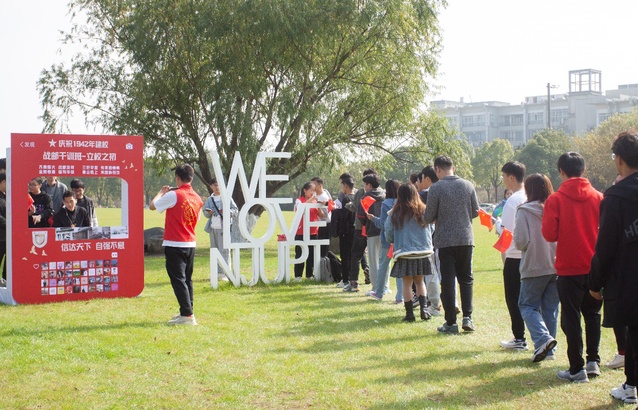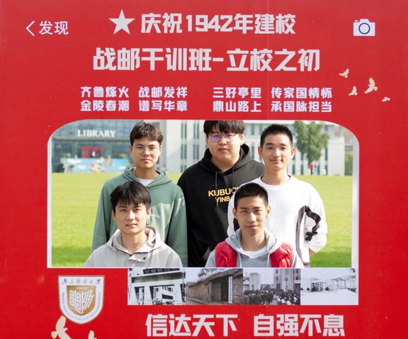 第2个打卡点宣传牌内容为:“1942—战邮干训班 立校之初。1942年,太阳成城集团tyc234cc古天乐创办于山东抗日根据地的‘战时邮务总局干部训练班’,79年来,一代代南邮人育才报国守初心,信达天下承使命,谱写着南邮学子信息报国、科技报国的坚定理想和执着追求。”