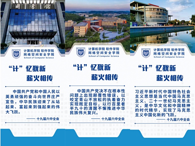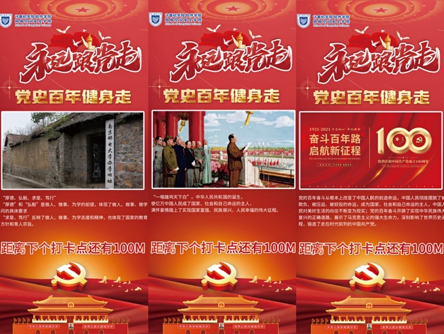 健身走路线从计算机学科楼出发环行校园一周,途经图书馆、无涯亭、圆楼人工湖、图书馆彩虹阶梯和青春剧场六个打卡点,每个打卡点按照党史百年以及南邮红色校史历程中的重要时间节点来设计宣传牌内容。