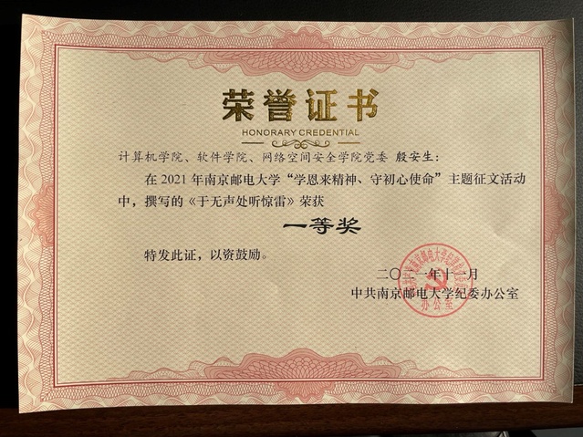 近日,由校纪委主办的“学恩来精神、守初心使命”主题征文比赛结果揭晓,公司党委报送的作品《于无声处听惊雷》荣获唯一的一等奖。