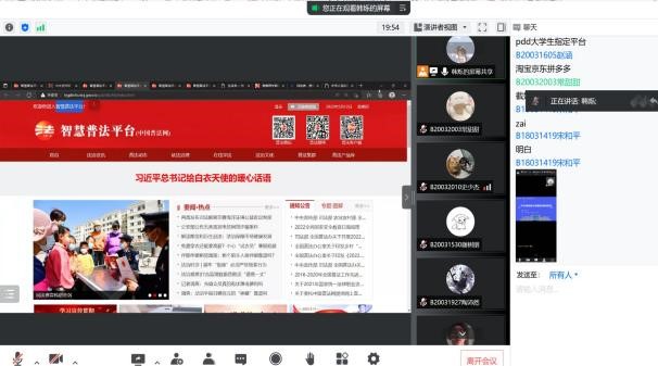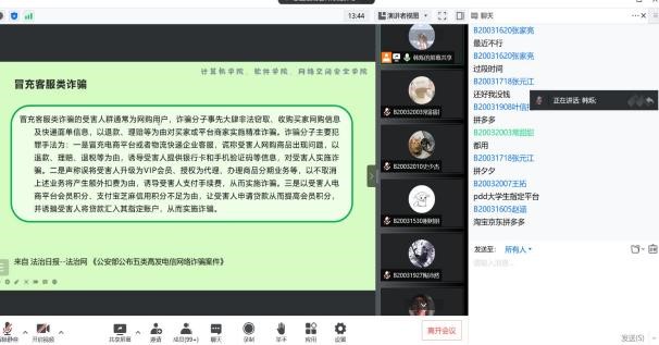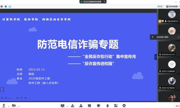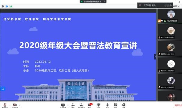 为增强员工法治意识,提高员工防电信诈骗能力,5月12日,公司召开“美好生活·民法典相伴”法治宣传和“全民反诈在行动”防范电信诈骗线上宣讲会,2020级软件工程和软件工程(嵌入式培养)专业全体员工参会,会议由辅导员韩烁主持。