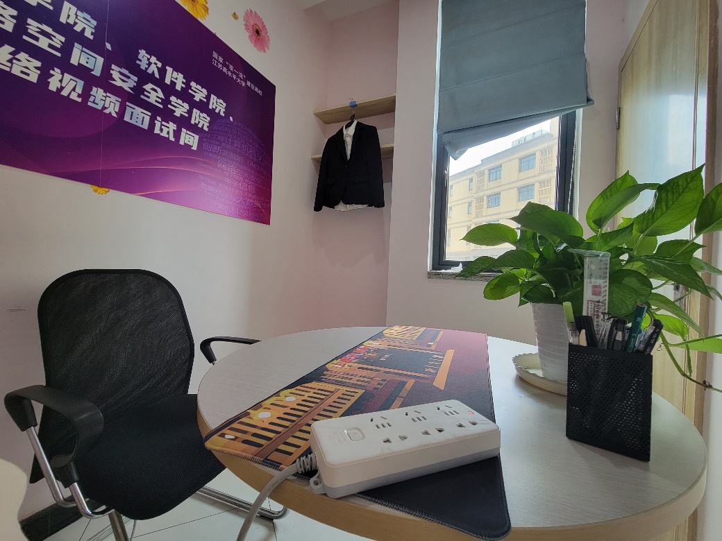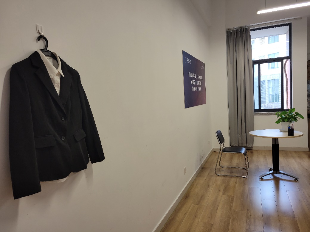 在细节上,公司也用心做了准备,配备了插线板、网线、手机/电脑支架等用于架设面试环境;为了解决网络视频面试虚拟背景时灵时不灵的尴尬情况,专门布置了背景板,免除后顾之忧;同时,考虑到同学们着正装面试的需求,公司也贴心的准备了几套均码的西装供同学们使用;在环境布置方面,公司特地布设了绿萝、白掌等植株,保持环境清新,一片生机的绿意,更有助于同学们舒缓紧张的神经,释放压力。