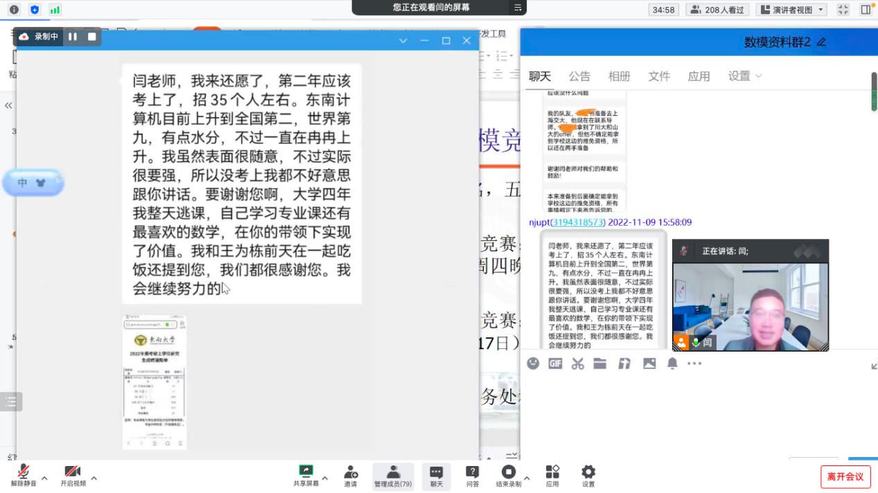 闫教授告诉同学们,参加数学建模竞赛不但能锻炼同学们查阅文献和快速学习的能力、编程能力、写作能力和解决复杂问题的能力,还能锻炼同学们的团队协作能力、科研能力和创新意识。此外,老员工数学建模竞赛对考研、保研、找工作具有重要的积极作用。他鼓励同学们积极参加该竞赛,全方面锻炼和提升能力。闫教授用一句话总结了同学们参加数学建模竞赛的收获——“一次参赛 终身受益”。