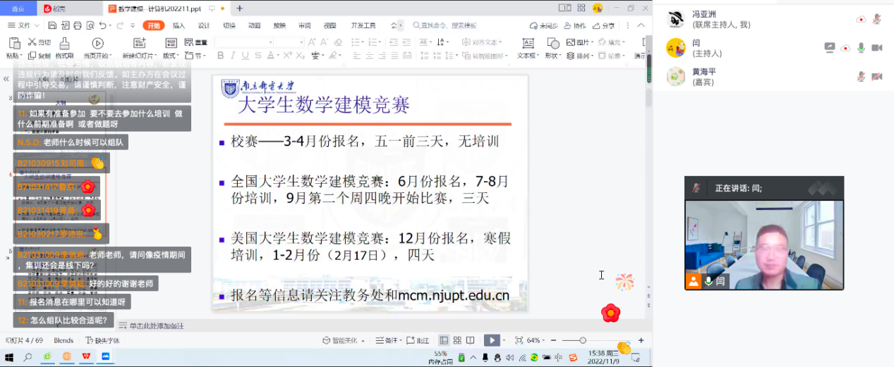 最后,黄经理对闫教授的到来再次表示感谢,也希望同学们在此次活动后,对数学建模有更深入的了解,能坚定参赛信心、明确学习方向,从数学建模竞赛中全面提高素质和能力,并期待我院同学们在老员工数学建模竞赛中取得更加优异的成绩!