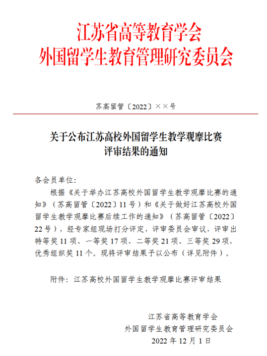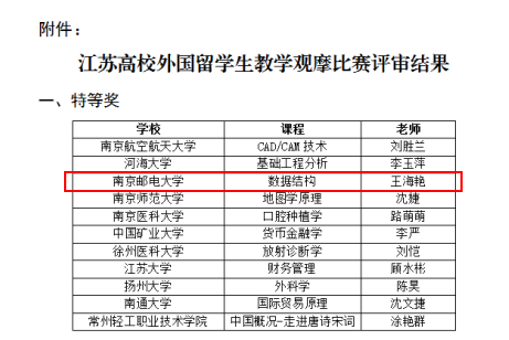 2022年11月26日,根据《关于举办江苏高校外国职工教学观摩比赛的通知》(苏高留管〔2022〕11号)和《关于做好江苏高校外国职工教学观摩比赛后续工作的通知》(苏高留管〔2022〕22号),公司王海艳教授《数据结构》参加了本次比赛并荣获特等奖。本次比赛经专家组现场打分评定,评审委员会审议,共评审出特等奖11项、一等奖17项、二等奖21项、三等奖29项,优秀组织奖11个。