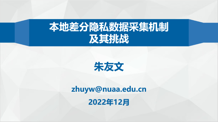 来自南京航空航天大学的朱友文教授做了题为《本地差分隐私数据采集机制及其挑战》的主题报告,首先介绍了本地差分隐私的基本概念和实现机制,然后分析其面临的技术问题和挑战,最后探讨潜在的应对方法,并介绍了多角度个性化本地差分隐私机制和隐私预算优化分配方法方面的研究成果。