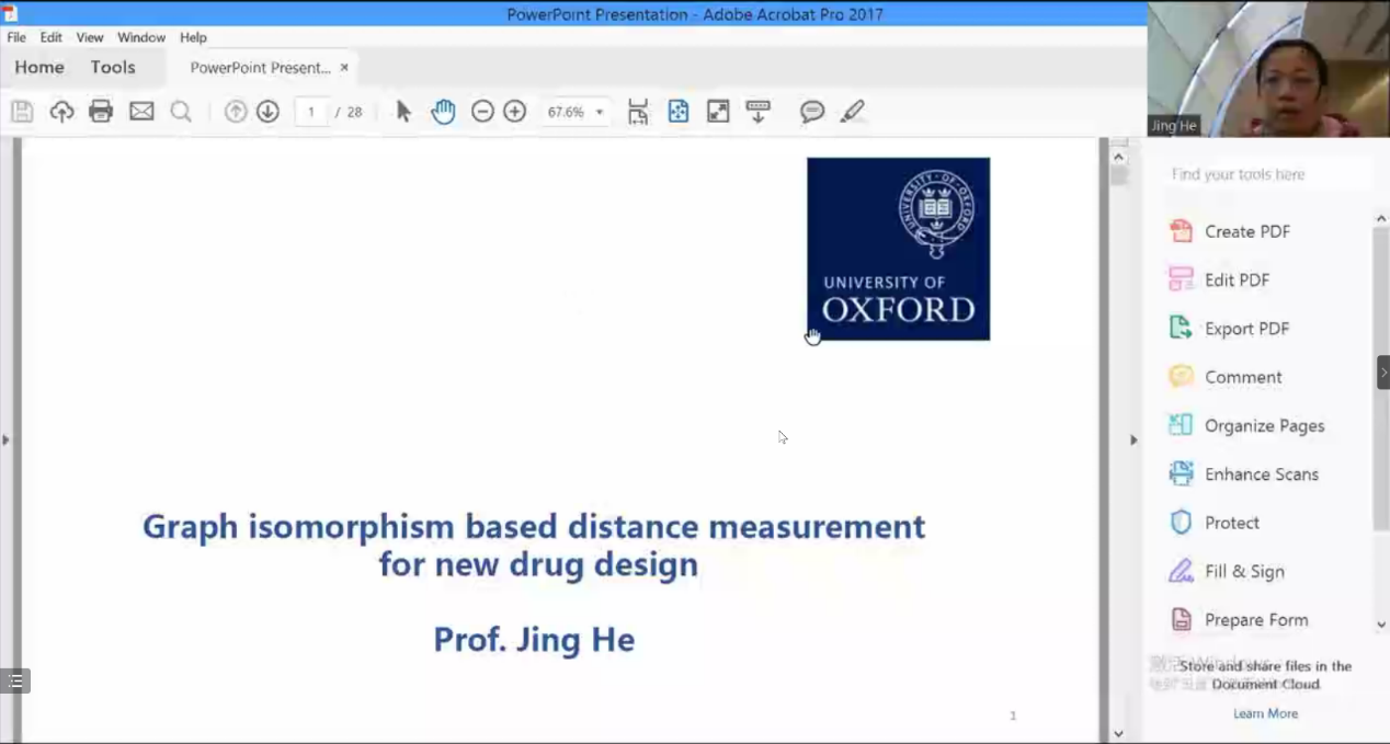 来自太阳成城集团tyc234cc古天乐的何静教授做了题为《A New Drug Design Method based on Structural Distance Measurement》的主题报告,首先介绍将基于图同构的拓扑距离测量应用于新药设计研究思路,然后提出面向图分析的具有表征能力距离度量,最后系统地从几何和语义角度分别对比图之间的相似度和距离,以及新度量在药物设计方面的作用。