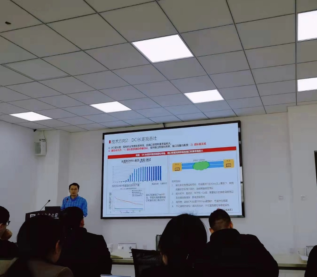 专家报告会由公司韩磊教授主持。华为数据中心网络首席研究员郑晓龙博士、园区网络副主任陈昊博士、计算存储网络负责人王伟光博士分别作了题为《华为数据中心网络规划与技术》《华为园区网络技术规划与技术》和《华为云与计算网络规划与技术》的报告。紫金山天文台百人计划李国亮研究员、张松波博士分别作了题为《空间站望远镜的相关计算》和《时域巡天的自动化与大数据挑战》的报告。公司肖甫教授、樊卫北副教授、王俊昌副教授、何昕博士也分别作了题为《长距无损技术创新思路研究》《效率优先的网络架构设计思考》《端网协同的存储网络技术创新》和《数据中心网络可靠性设计》的报告。吴雪峰副台长对研讨会做了总结发言。