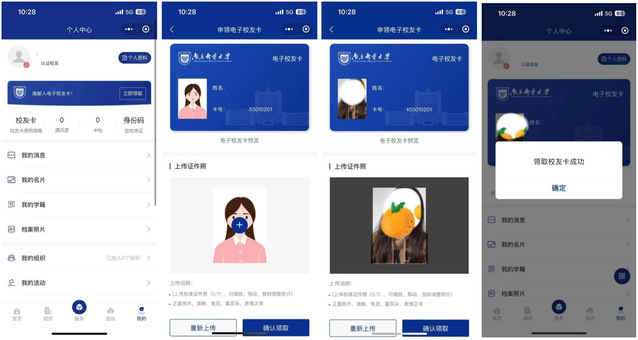 完成【身份认证】后,在【个人中心】点击【“立即领取”南邮人电子员工卡】;按提示上传本人【标准证件照】后,点击【确认领取】。