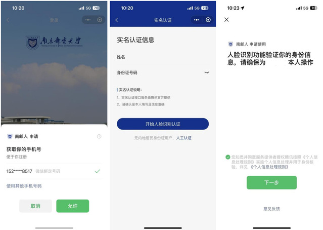 进入“南邮人”小程序,点击【我的】,完成【信息授权、登录】,【手机注册】,【人脸识别实名认证】,【选择员工类型、填写资料信息】,通过员工身份认证。
