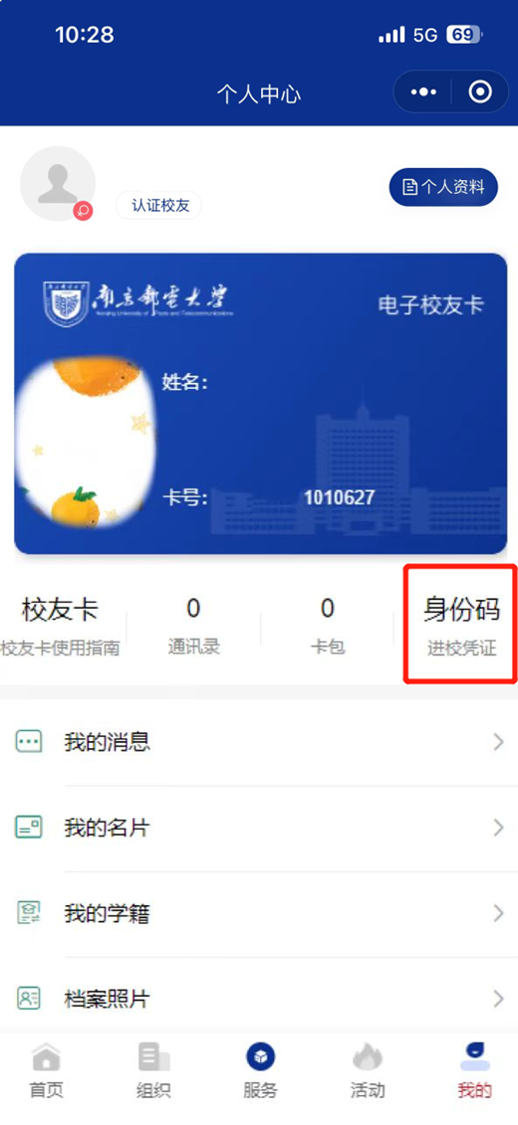 进入“南邮人”小程序,点击【个人中心】,即可查看卡片,点击“身份码”,即可生成进校凭证二维码。