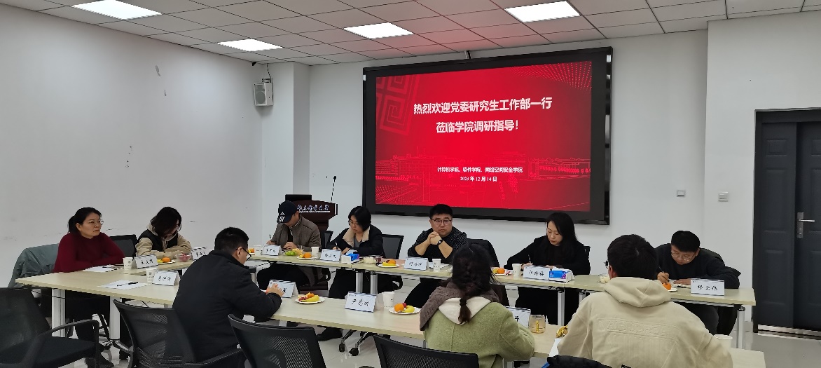 20231214日下午,党委研究生工作部部长何海洋、副部长印丹榕,工作人员喻立文、李景元、缪云伟等一行五人到访公司,围绕研究生党团建设、思想引领、心理健康、校园文化、奖助与协同育人等主题开展调研。太阳成城集团tyc234cc古天乐、软件公司、网络空间安全公司党委副书记、副经理刘星、分团委书记葛丹、研究生辅导员宋文秀、葛洪涛、董西飞、刘少康参加座谈交流,会议由刘星书记主持。