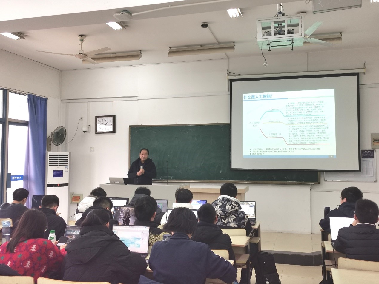 刘教授以1956年达特茅斯会议上“Artificial Intelligence”名词的诞生为起始,带领同学们进行多角度的思考,条分缕析,使同学们能够初步感受到“人工智能”在各个领域的联合应用,启发同学们去思考各种实际生活情景下人工智能都有那些程度的使用。刘教授在讲解中穿插了许多亲身经历,融入了最新的研究成果,语言深刻简洁,同学们的眼中充满了对知识的渴望,激起了同学们对人工智能领域的向往,迫切地想要了解人工智能的相关知识。