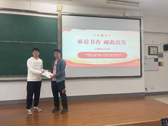 岁岁毕业,今又毕业。近日,计软网安院研2021级第一党支部即将毕业离校的党员同学,与研2022级第一党支部的学弟学妹相聚一堂,共同举行了一场题为“乘着书香 邮此出发”的党日活动。活动分为党纪学习教育、学长对我说、互赠书籍三个环节,通过共同学习《中国共产党纪律处分条例》、交流发言、互赠书籍等方式,传递知识与智慧,发扬党的优良传统,增进彼此间的情谊。