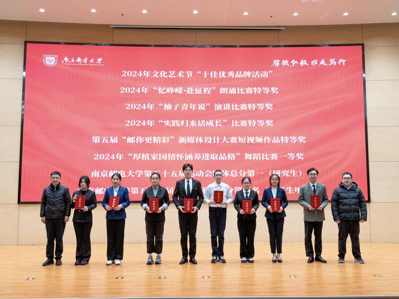 文体表彰环节,表彰了在各类文化艺术和体育赛事中取得优异成绩的员工团队和个人。获奖名单包括2024年文化艺术节“十佳优秀品牌活动”、 “忆峥嵘·赴征程”朗诵比赛特等奖、“柚子青年说”演讲比赛特等奖、“实践归来话成长”比赛特等奖、“邮你更精彩”新媒体设计大赛短视频作品特等奖、“寻梦而行,对话青春”主持人大赛一等奖、“厚植家国情怀,涵养进取品格”舞蹈比赛一等奖,以及校第五十五届运动会团体总分第一(研究生)、团体总分第三名(本科生甲组)的优秀团队和个人。