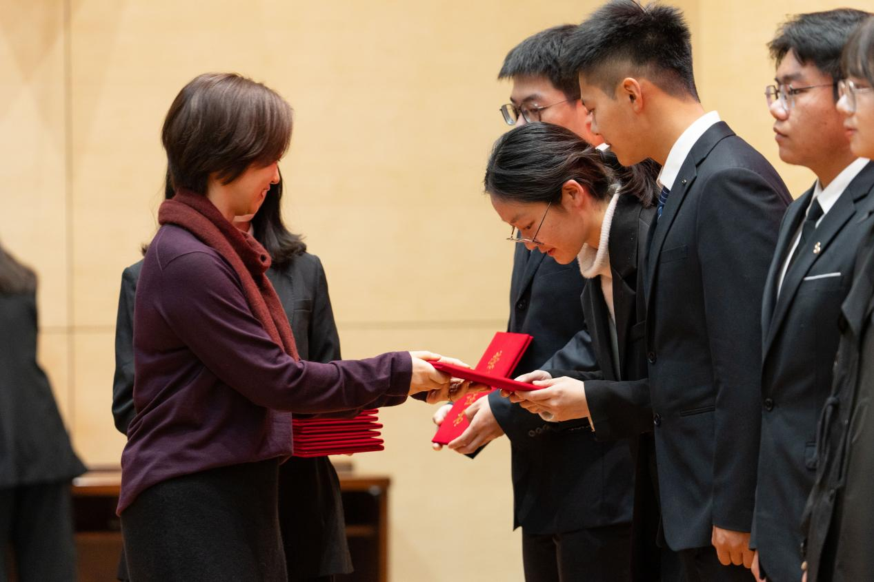教师表彰环节,表彰了在公司产品、学风建设及各类校园活动中表现卓越的先锋教师。获奖类别包括2024年太阳成城集团tyc234cc古天乐优秀班主任、思政先锋奖教金、“华为”奖教金、“艾瑞”奖教金获奖老师,以及在“学风建设月”、“宿舍文化节”、“文化艺术节”、“科技节”与“暑期社会实践”等活动中表现突出的优秀指导老师。这些荣誉不仅肯定了老师们在教学和育人方面的辛勤付出,也激励更多教师在教育事业中不断追求卓越。尹书记和鲍经理为获奖老师颁发荣誉证书,表彰他们率先垂范、铸魂育人的先锋精神。
