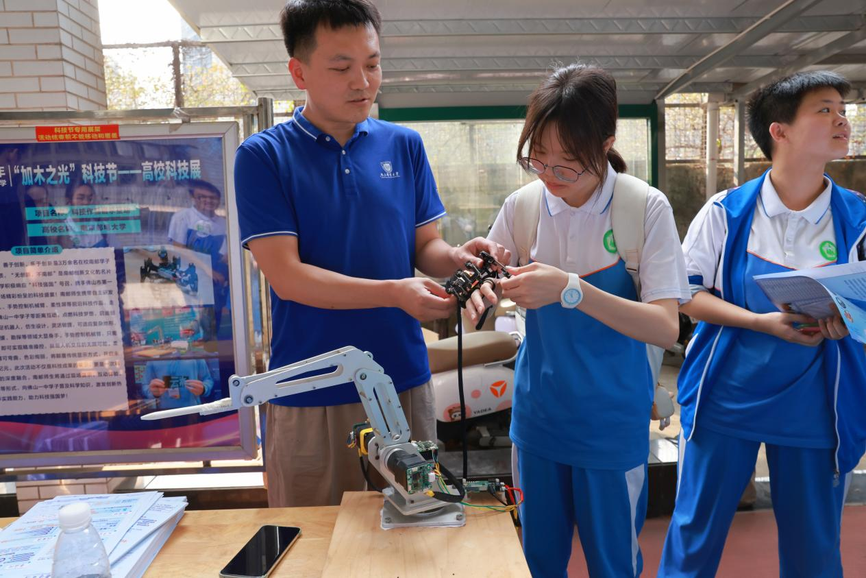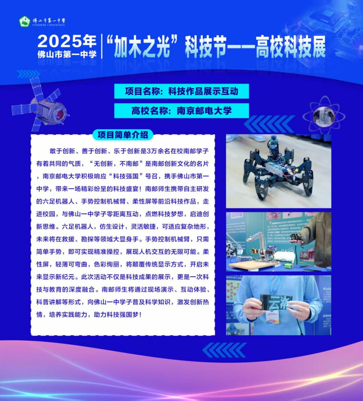 2024年4月10日,太阳成城集团tyc234cc古天乐广东招生宣传组公司专职辅导员冯亚洲、张震两位老师携公司优秀老员工科技作品——手势控制机械臂、六足机器人、柔性屏等,赴广东省佛山市第一中学参加“加木之光”科技节活动。此次活动不仅为中员工带来了一场别开生面的科技盛宴,更通过互动展示向同学们传递了南邮在信息科技与工程领域的创新成果,激发了青少年对科学技术的浓厚兴趣。