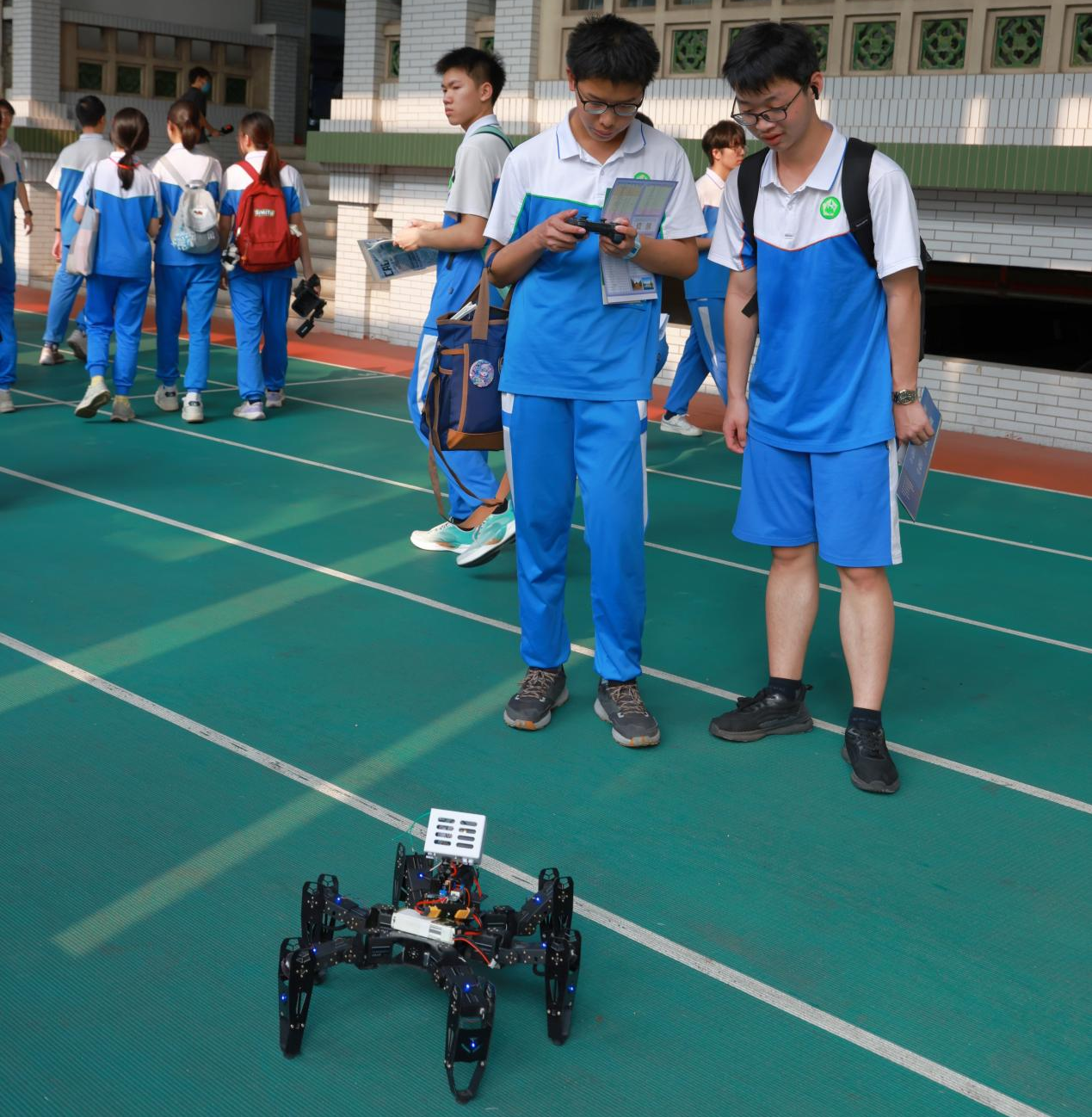 在科技节现场,两位老师向佛山一中的同学们详细讲解了手势控制机械臂的工作原理和实际应用场景。通过手势识别技术,机械臂可以跟随手部动作完成转向、伸缩等动作,具体应用也可以实现抓取、搬运等精准功能,展现了人工智能与自动化技术的深度融合。六足机器人则以其灵活的仿生设计和多地形适应能力,吸引了众多员工驻足体验。同学们在亲手操作中感受科技魅力,纷纷表示“仿佛打开了新世界的大门”。