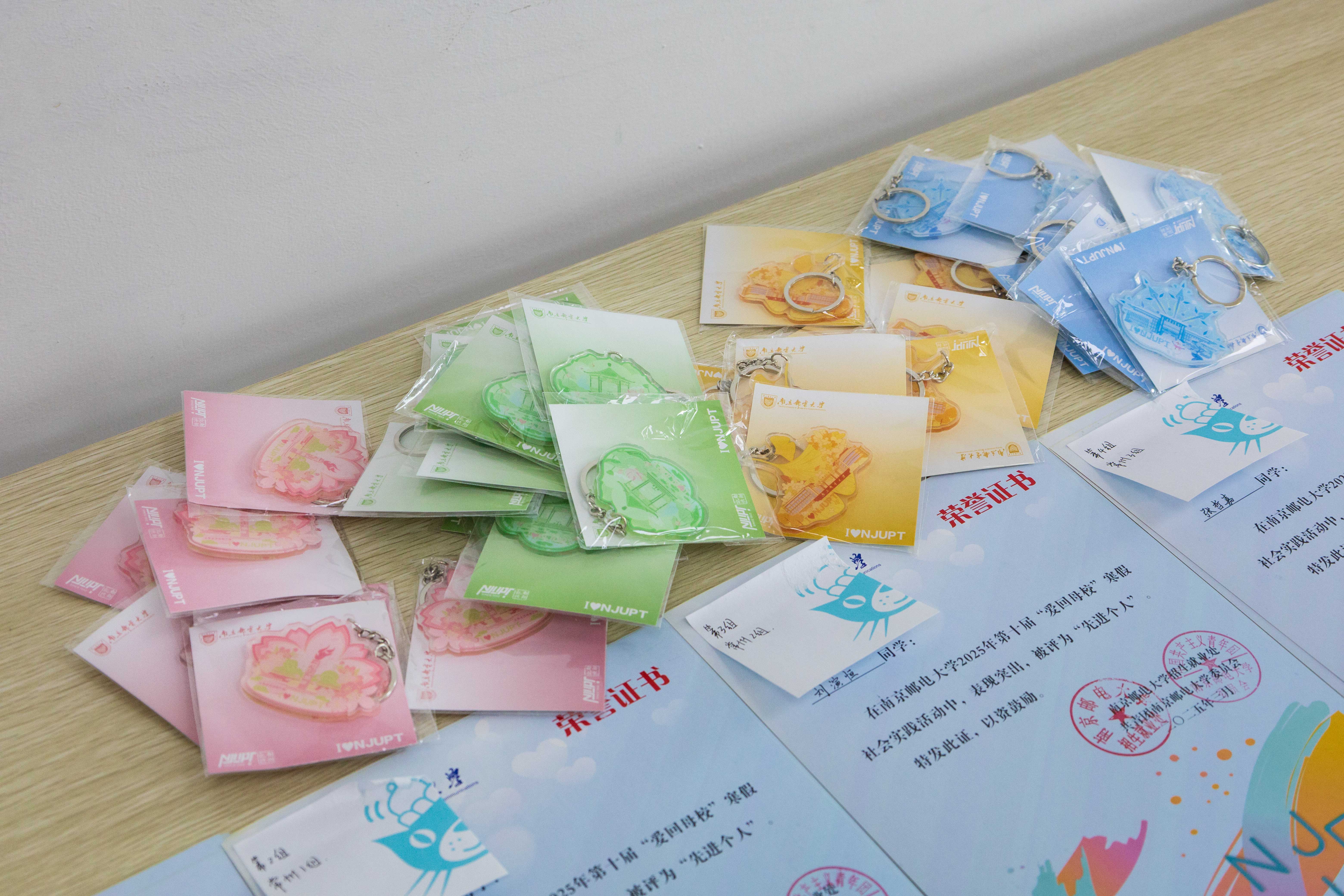 表彰环节中,葛丹老师和赵一琳老师为43名先进个人颁发荣誉证书,同时将印有南邮四季美景的定制钥匙扣作为志愿者参加活动的纪念品,“春樱、夏荷、秋枫、冬雪”寄托着公司对志愿者们四季相伴,共赴未来的期许。