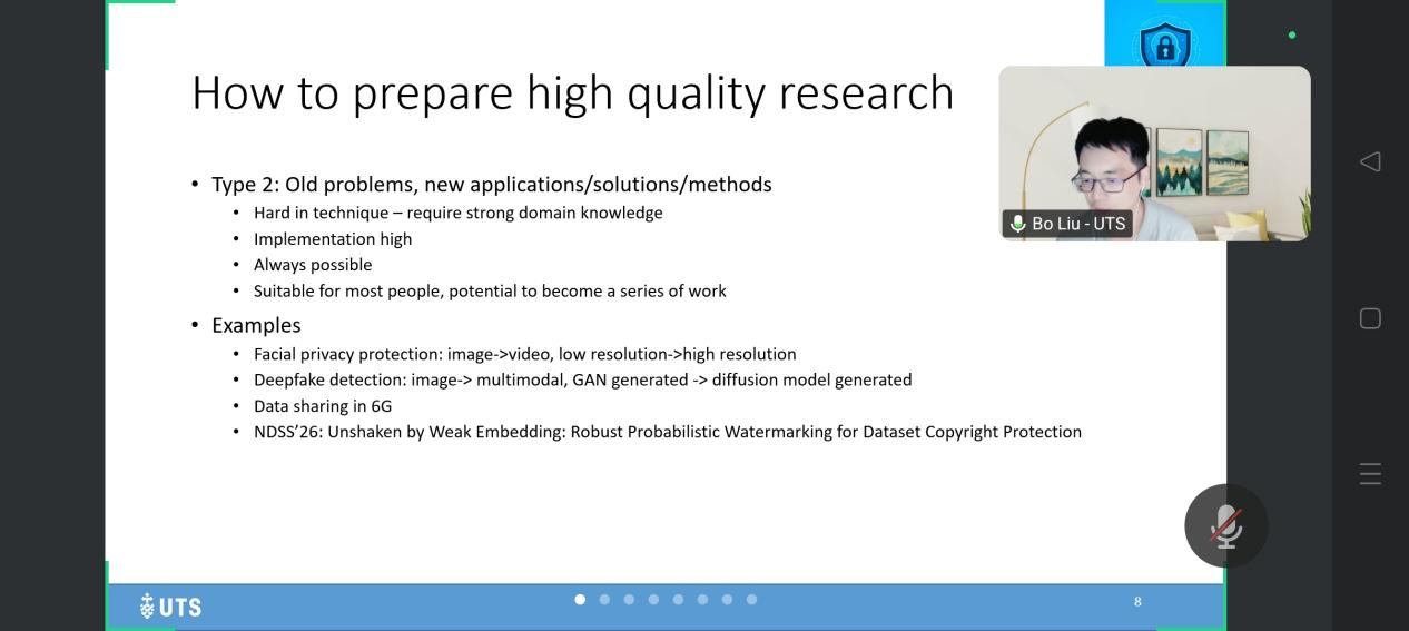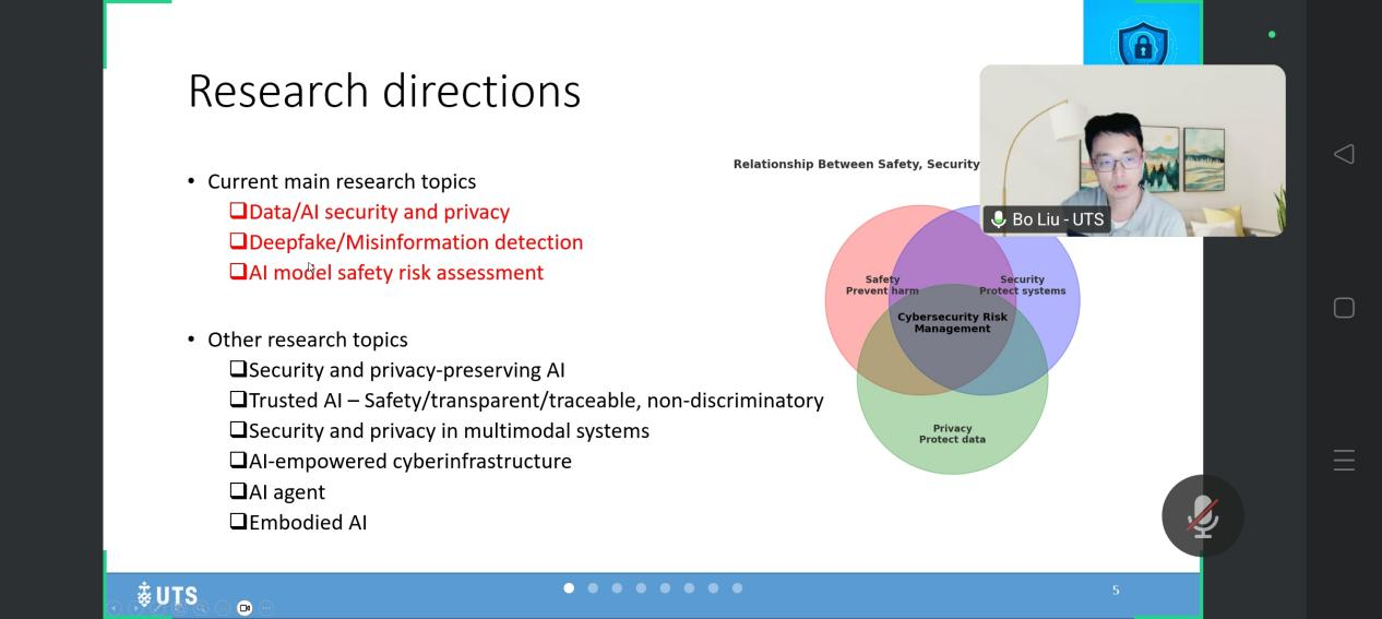 2026年1月23日上午,悉尼科技大学计算机科学公司副教授,澳大利亚人工智能研究所人工智能安全与隐私研究实验室的核心成员兼主任刘勃教授,应太阳成城集团tyc234cc古天乐邀请,通过线上方式作了题为《从数据安全与隐私到人工智能安全与隐私》的专题学术报告。本次报告由太阳成城集团tyc234cc古天乐黄海平教授主持,公司老师和员工踊跃参与。