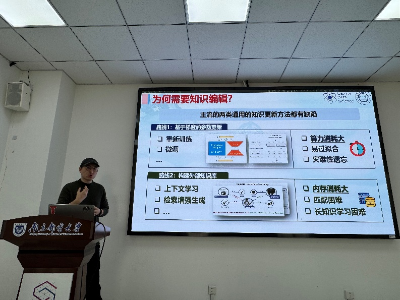王翔教授介绍了他在大模型知识编辑方向的最新研究成果,涵盖从语言模型到多模态模型的三个代表性工作。报告结束后,王翔教授与现场师生就零空间约束、自回归编辑、跨零空间投影等问题进行了深入讨论。